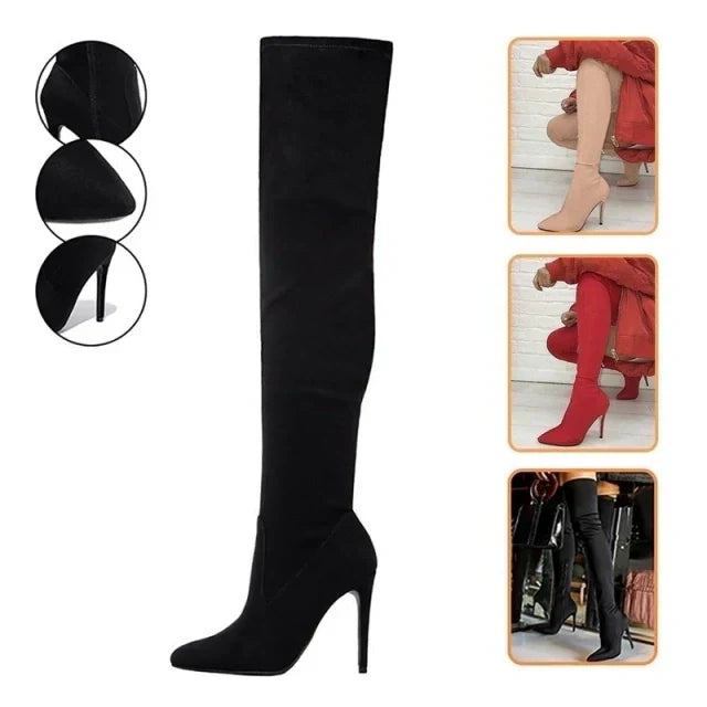 Bota Longa Feminina De Malha Salto Fino Com Zíper Na Lateral Tendência