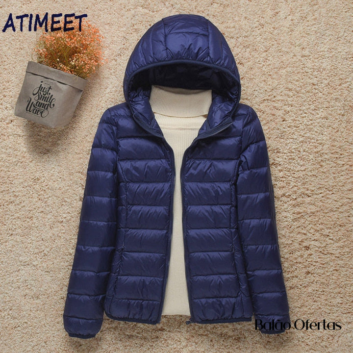 Esta jaqueta leve e ultra-portátil é feita com poliéster de alta qualidade e preenchida com pato branco para mantê-la quente e aconchegante.